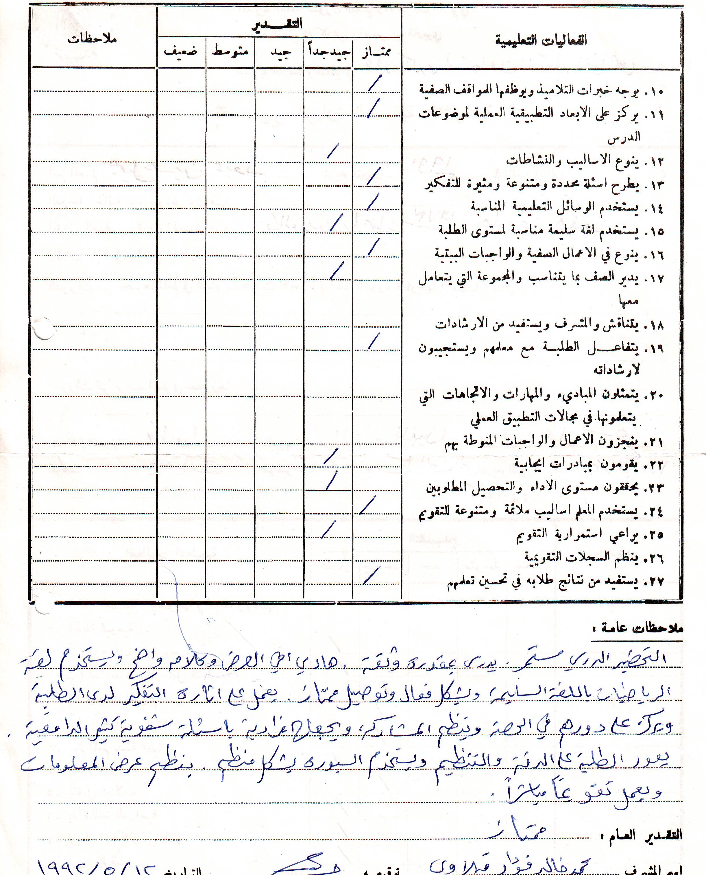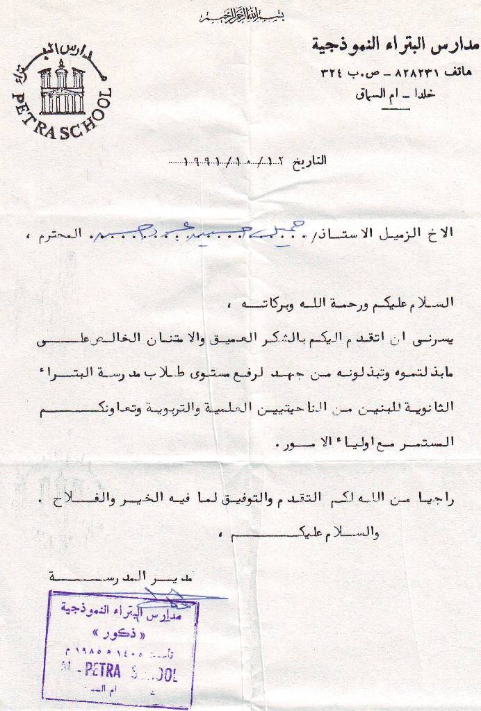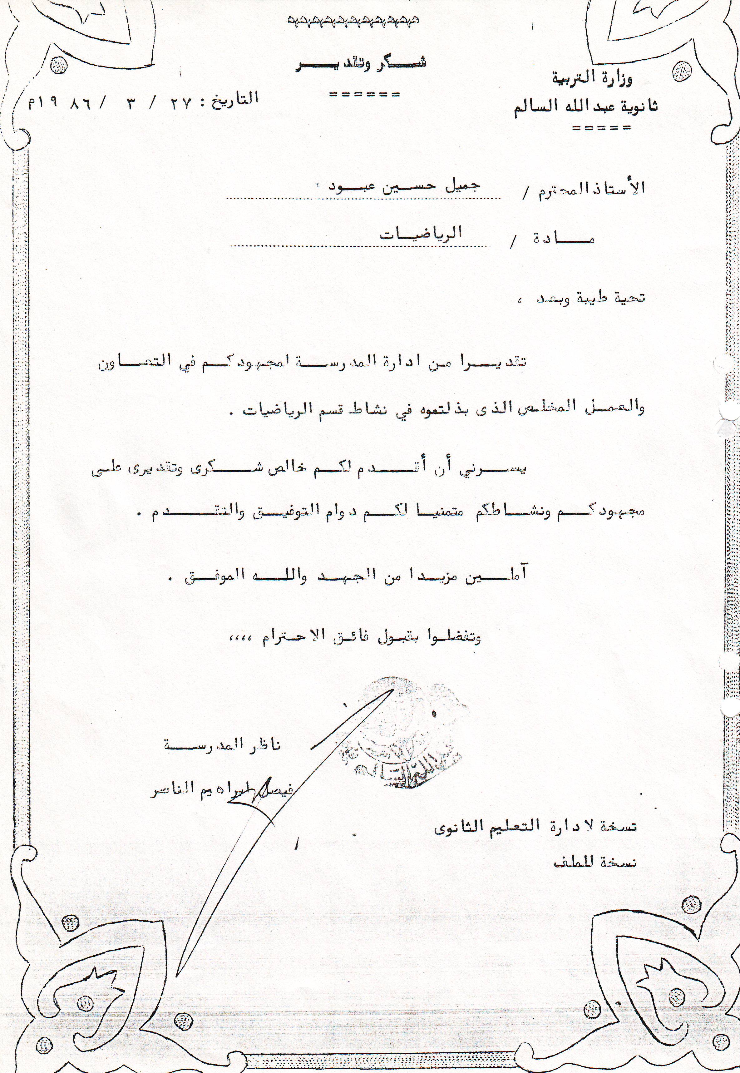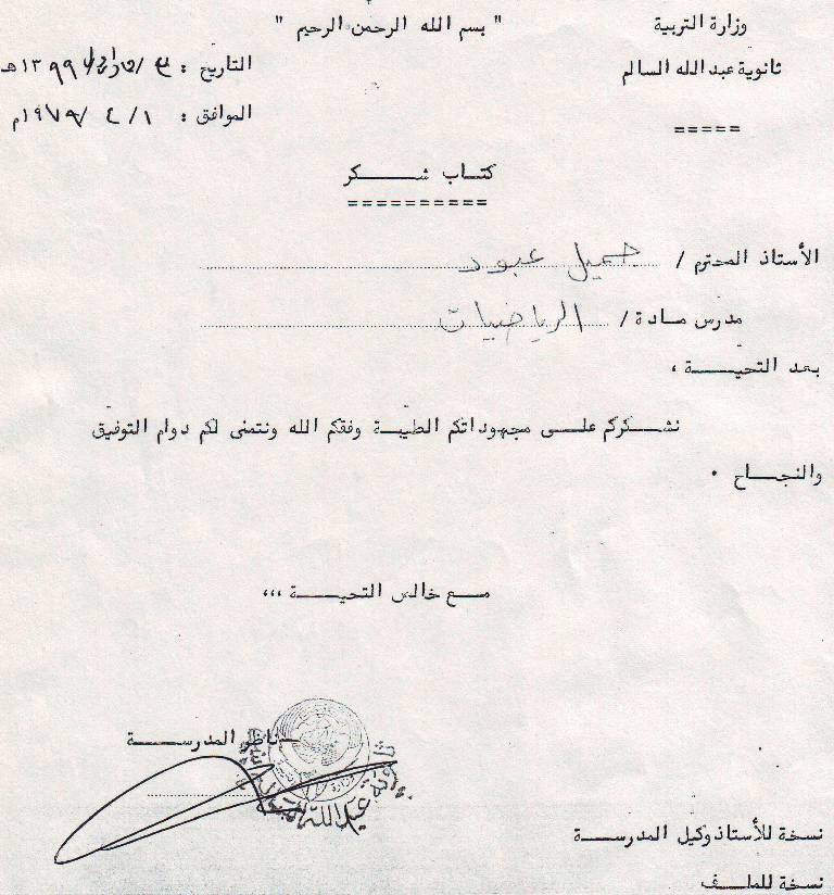 ظهر من التقارير الواردة إلى هذا القسم خلال العام الدراسي الحالي 1974/1975 أن عملك كان في مستوى يدعو إلى تهنئتك وتوجيه الشكر إليك لتقديرك الواعي للمسئولية الملقاة على عاتقك وتفانيك في خدمة طلابنا الذين نبني على مستقبلهم كبير الآمال مما ساعدهم على تحقيق نتائج مشرفة راجياً أن تحرص على الحفاظ على مثل هذا المستوى وأن تستمر في العمل بمثل هذه الروح الطيبة لتحقيق نتائج أفضل في العام القادم مع تمنياتي لك بالتوفيق والنجاح.