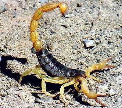 العقرب من الحشرات الزاحفة السامة ويتلون بلون الأرض التي يوجد بها ويمتلك غدة سمّية في مؤخرته يقوم بتفريغها في جسم فريسته وقرصته لا تميت كقرصة الحية لكنها مؤلمة جداً والعقارب أنواع وأحجام وألوان مختلفة حسب المكان الذي تعيش فيه وهو يتواجد في جميع الأماكن خاصة في الجحور والأماكن المهجورة وتحت الحجارة ويتجرأ ويدخل البيوت إذا تمكن من ذلك وفي أيام البرد ينكمش على نفسه أما في أيام الحر فيصبح عدواني وهو حشرة شرسة معتدية لا توفر أحداً وقد قيل عنه (محل العقرب لا تقرب ومحل الحية أفرش ونام) ومن طريف القول أن أنثى العقرب لا تلد وعندما تحين ولادتها ينفجر ظهرها ويخرج منه أولادها خلال يومان ويتغذون على جسم أمهم لمدة ثلاثة أيام لهذا فهي من المخلوقات النادرة التي يقتلها صغارها.